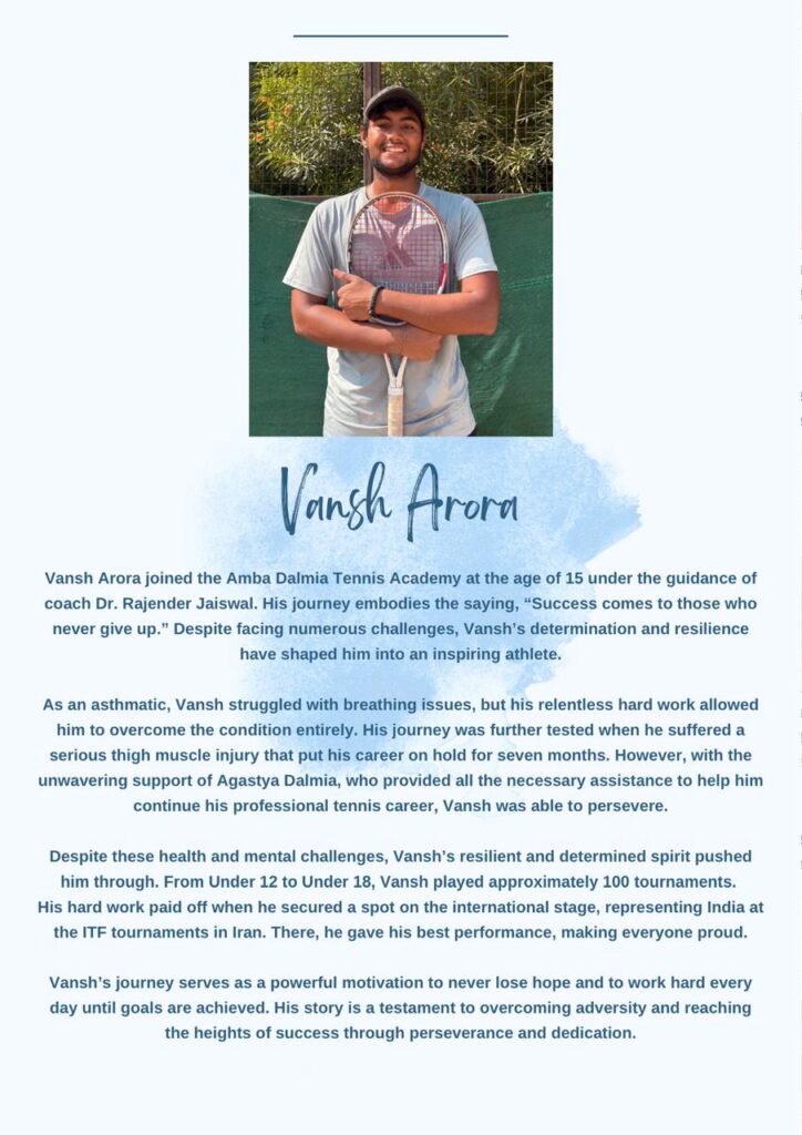 Vansh Arora joined the Amba Dalmia Tennis Academy at the age of 15 under the guidance of coach Dr. Rajender Jaiswal. His journey embodies the saying, "Success comes to those who never give up." Despite facing numerous challenges, Vansh's determination and resilience have shaped him into an inspiring athlete.
